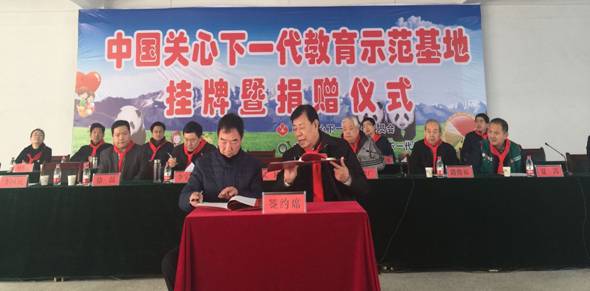 仪式上,武韬、张德广、夏嵩、路俊福共同为竹沟镇中心小学“中国关心下一代教育示范基地”揭牌,武韬代表中国关工委、中国社会福利基金会关心下一代基金和(台湾)财团法人中国信托慈善基金会向竹沟镇中心小学捐赠50万元及“中华魂书屋”学习书籍,并与竹沟镇中心小学签订建设教育示范基地协议。