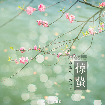 我国古人划分惊蛰三候为:“一候桃始华;二候仓庚鸣;三候鹰化为鸠。”其中一候所对应的花信为桃花,二候为杏花,三候为蔷薇。